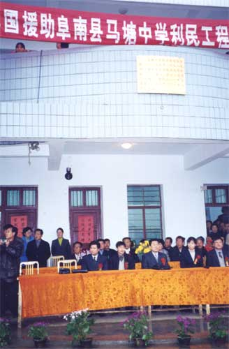 阜南县位于皖西北与河南省交界之处,农业是主要产业,人口约142万,也是向沿海城市提供大量劳动力的地区。马塘中学于1956年在阜南县苗集镇(人口约5.3万人)开办,全校学生约800人,因教室不足、设施老化,急需建设新的校舍。 新校舍建在离旧校约1.5公里处,工程费用共计105万元,其中利民工程援助资金占60万元,新校舍是一幢白色的4层楼房,有图书室、实验室等18间,在当地是十分醒目的建筑物。今后学生人数将会增加,最多可达1300人的规模。