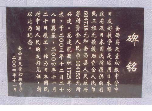 位于安徽省西南部山区的岳西县人口约40万,产业仅有农业,2002年人均收入1448元,为国家级贫困县。天堂中学在天堂镇(村)学校里有核心地位,74年建校,校舍为砖砌平房,多年风吹雨淋后现已为危房(D级,最危险一级)。故县政府于2001年在距原校2.5公里交通便利之处建新校舍,新校舍中共有初中1、2年级1080人、包括原在其他学校的学生学习,但3年级(501人)仍在有倒塌危险的旧校舍上课,急需改善教育环境,然而资金筹措困难。此次,我国政府提供了建设教学楼(1725㎡)的一部分资金,此教学楼已经考虑到今后学生的增加。本项目完成后传来好消息,村里学龄儿童均已入学,该校将作为一所样板中学继续发展。