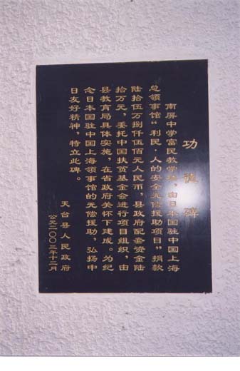 天台县位于浙东,人口54.2万,南屏乡为贫困乡,位于该县南偏东处,约17400人,由34个行政村组成。该乡4所小学均被划入危险房屋,缺窗少门,频频漏雨,老化严重,故计划拆除后建设当地的核心学校(名称为中学),以进行9年一贯制的义务教育。为此,在总费用126万元中,日本政府决定用利民工程无偿援助提供缺口部分约66万元。