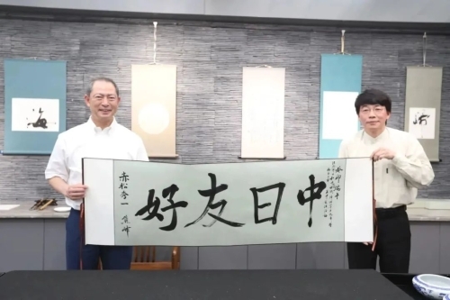 <赤松大使与书法家熊峰一同挥毫>
