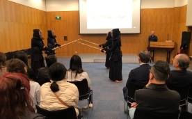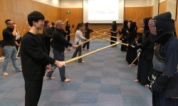 在餐叙交流不断深入后的剑道活动中,剑道爱好会的各位为大家带来了简短的介绍与展示,随后还进行了跪坐、默想等剑道礼仪以及“击面”体验。