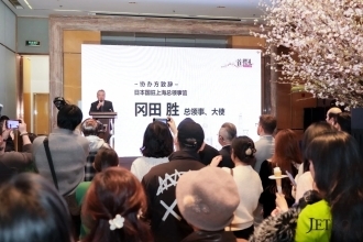 1月12日,总领事、大使冈田胜在上海国金中心出席日本樱花展览会“首樱礼”活动并致辞。