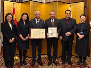 1月29日,总领事、大使冈田胜在总领事官邸向海上印社副社长陈茗屋先生颁发大使表彰状,对陈茗屋先生多年来做出的巨大贡献表示感谢和敬意。